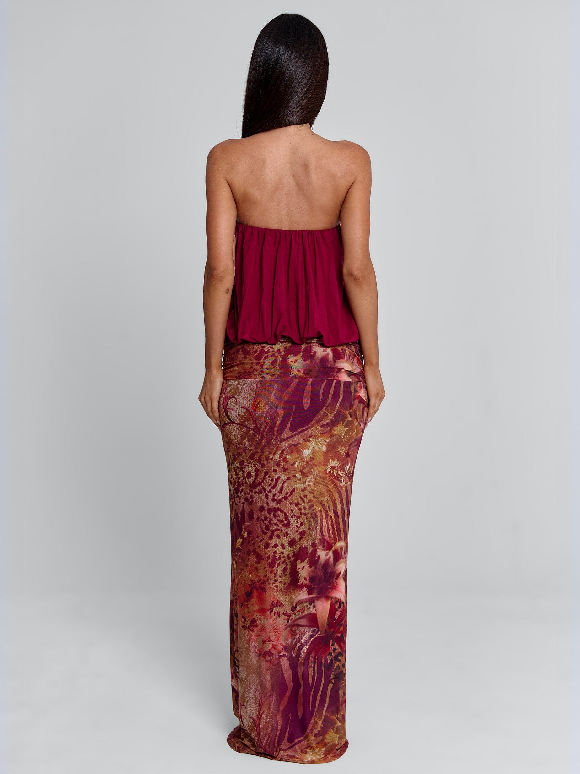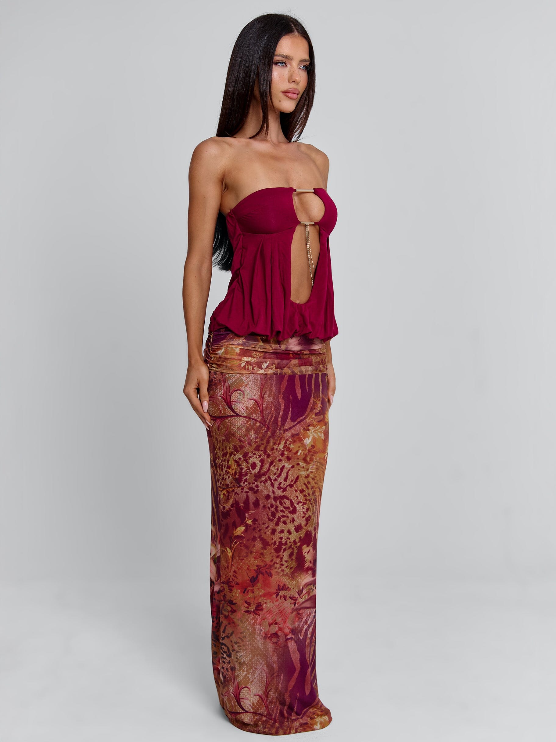 Designed with a printed mesh skirt and a contrasting deep berry bodice, she features a daring centre cut-out and gold hardware detail at the bust. The billowy top flows effortlessly into a ruched waistband and figure-hugging maxi skirt, creating the perfect balance of movement and structure.