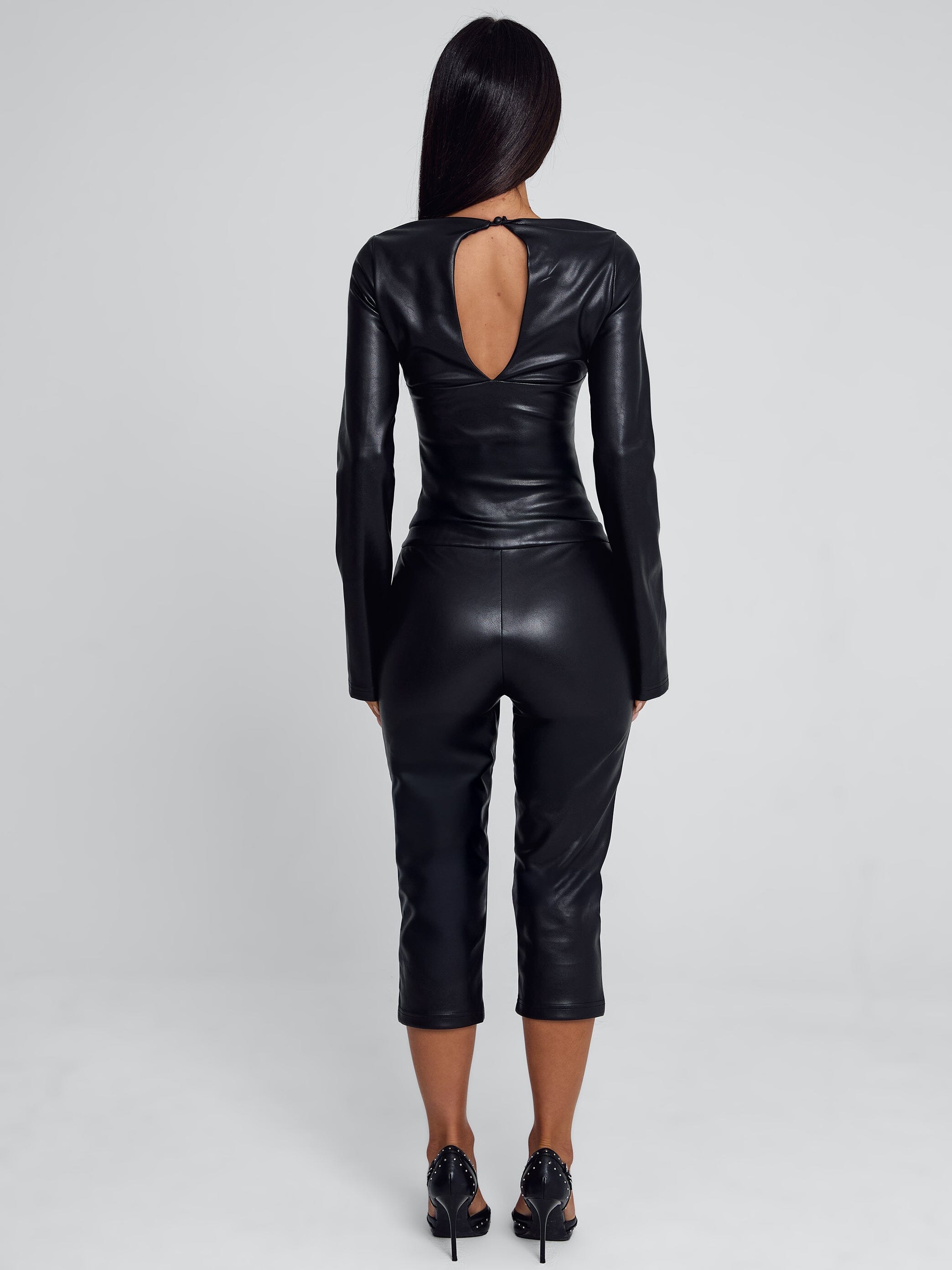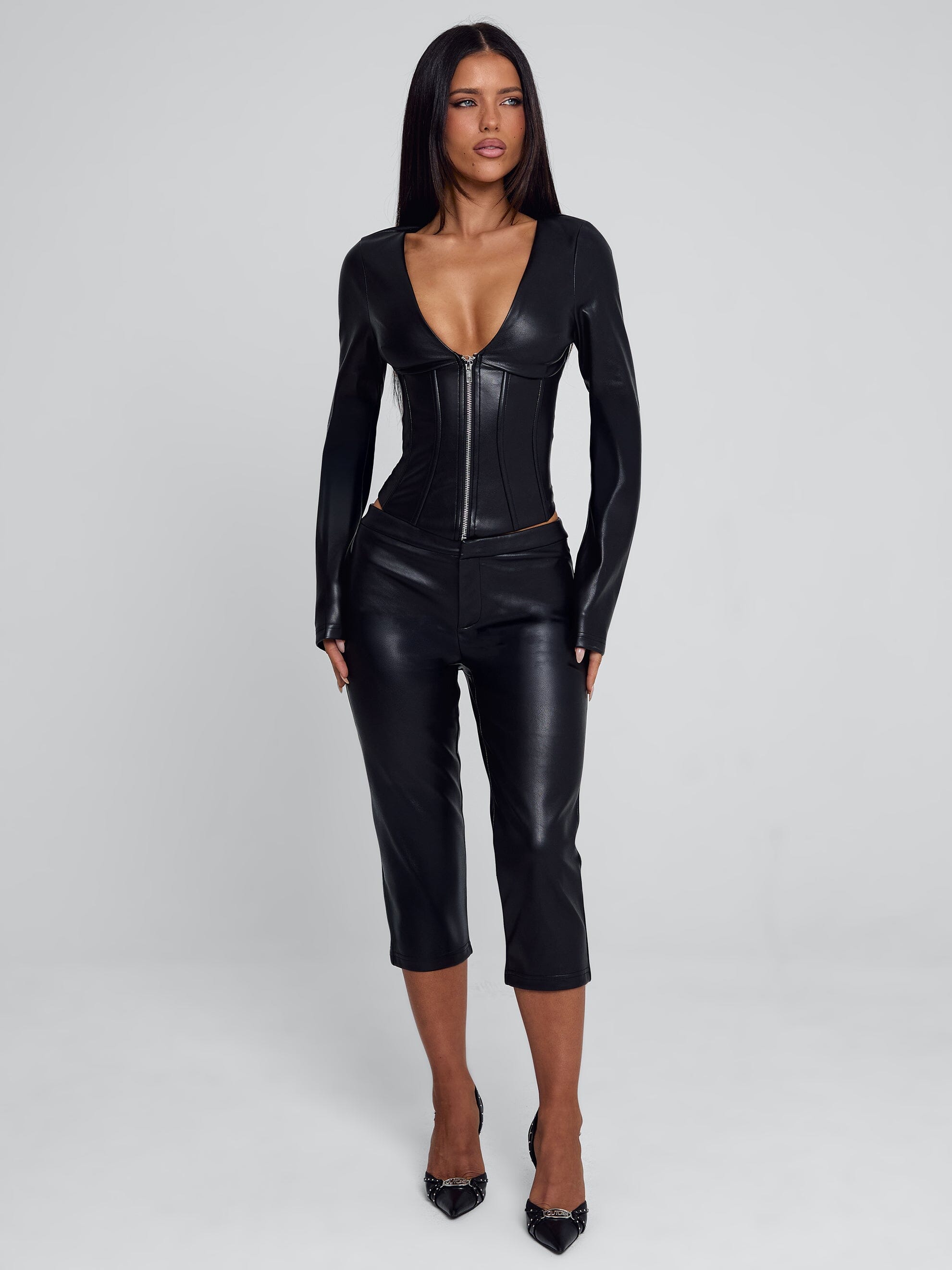 Crafted from a stretch PU fabrication, she molds to your curves with a smooth, second-skin feel. Designed with a low rise waist and cropped capri length, she channels early-2000s energy with an elevated finish. The internal hook-and-bar closure keeps her clean and minimal, making her the perfect match to the Lorana Top.