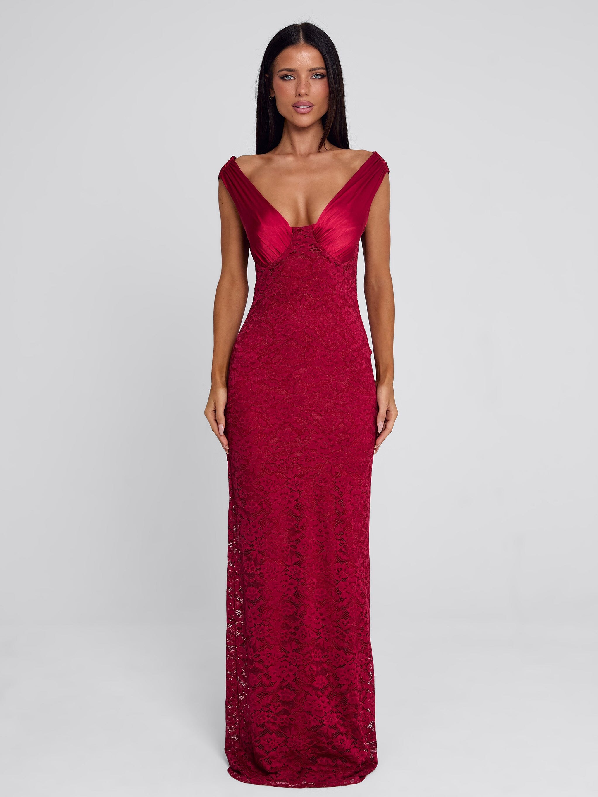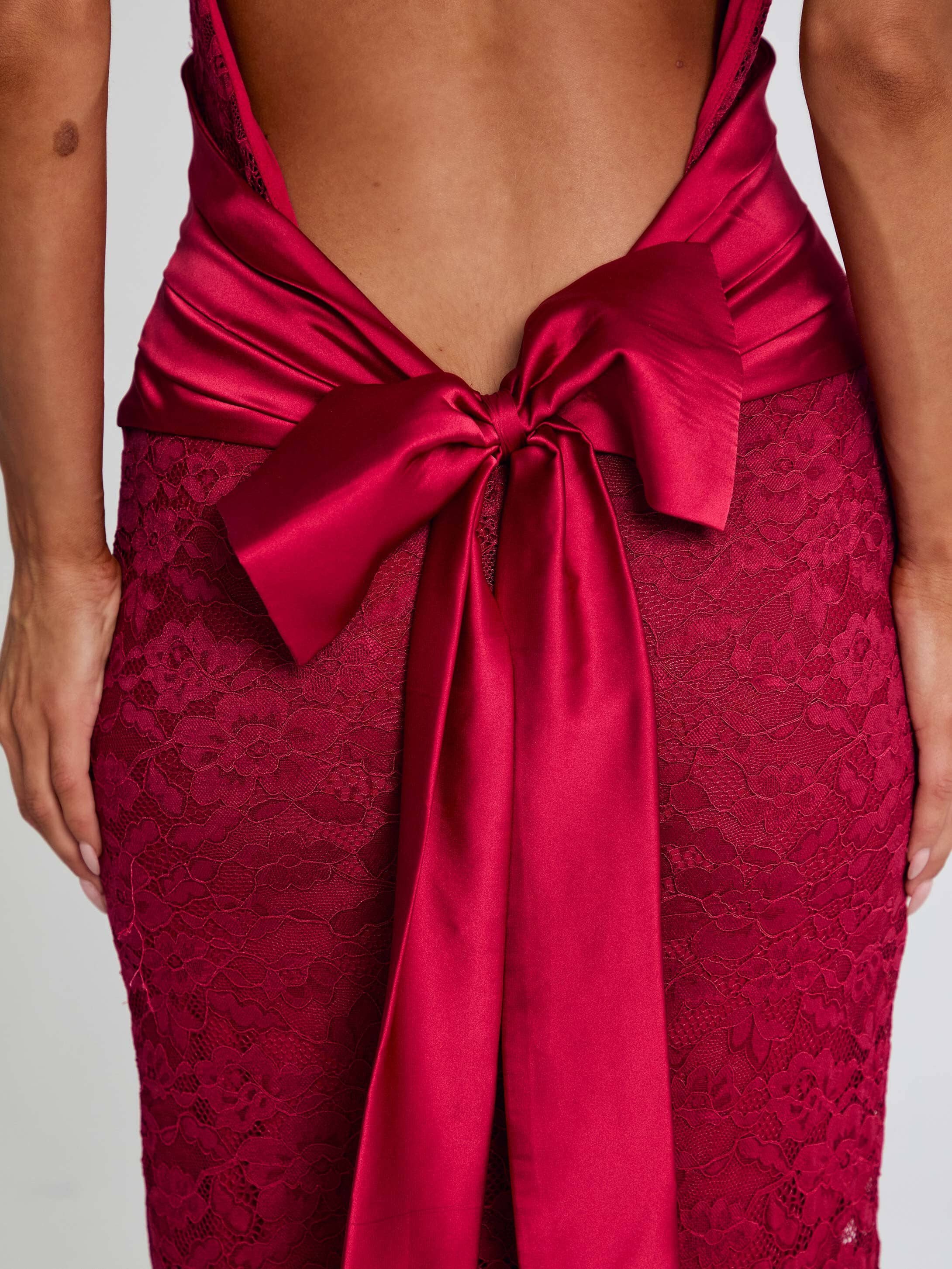 Crafted from a fully lined lace fabrication, she features an off-shoulder satin bust with a soft rose detail at the centre. The open back is finished with a satin clasp at the bust and a statement bow that drapes over the skirt, adding a refined touch to the silhouette. The maxi length keeps the look sleek and elegant.