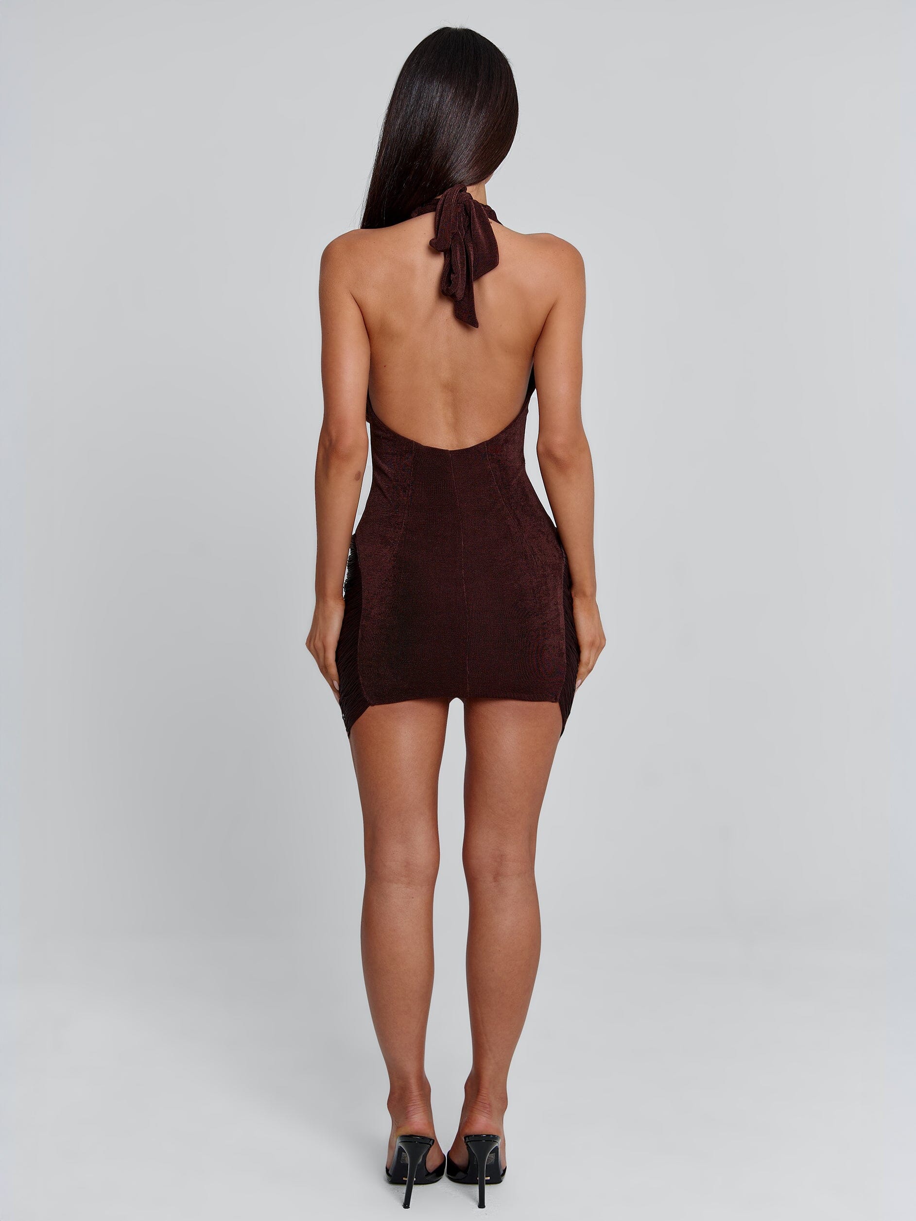 Crafted from a luxe stretchy jersey with a subtle shimmer, she contours the body with a figure-hugging fit. The halter neckline ties effortlessly at the back, leading to a daring low open back that exudes confidence. Fringing details along the front and sides of the skirt add movement and texture!